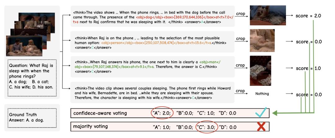 这表明,显式的时空证据不仅能在训练阶段提供监督信号,也能在推理阶段作为可靠的置信度衡量指标,帮助模型在多样化思维路径间做出更稳健的判断。