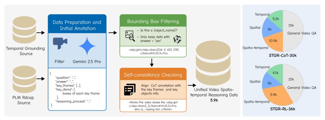 于是团队构建了首个面向显式时空推理的统一语料体系——STGR(Spatio-Temporal Grounded Reasoning),包括:STGR-CoT-30k与STGR-RL-36k两部分。