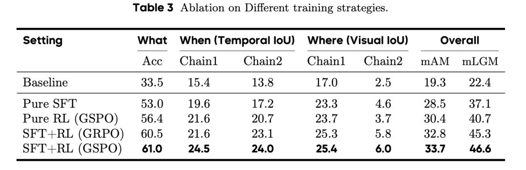 这表明冷启动阶段的结构化监督提供了必要的推理模板,而基于GSPO的强化阶段则进一步优化了模型的时空对齐与证据指向,从而实现稳定而可解释的推理能力。
