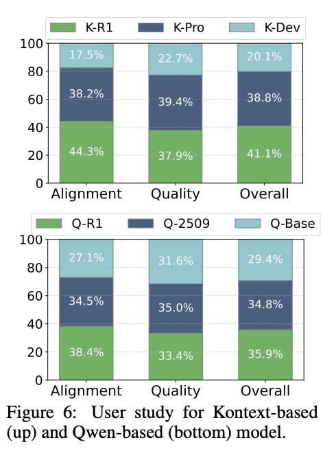 为了全面评估,研究人员还对FLUX.1和Qwen系列进行了人工偏好研究,参与者将本文的微调模型与其基础模型和更强大的版本进行比较。他们被要求在两个维度上选择最佳结果:指令对齐和图像质量。