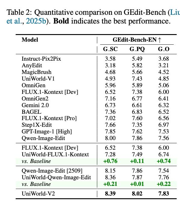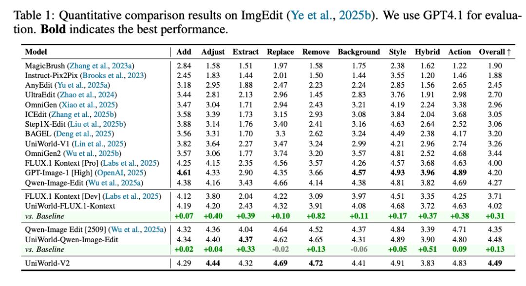 研究团队训练FLUX.1-Kontext [Dev]、Qwen-Image-Edit [2509]和UniWorld-V2作为基础模型,并采用ImgEdit和GEdit-Bench作为测试基准。前者将多种专门任务统一为一个通用框架以进行全面模型比较,后者通过丰富的自然语言指令评估通用图像编辑。