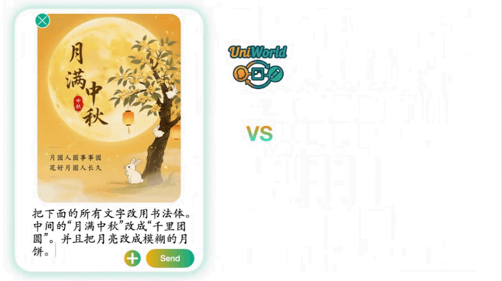 在论文的“海报编辑”示例中,模型能精准理解指令,并渲染出“月满中秋”和“月圆人圆事事圆”等笔画复杂的艺术中文字体,效果清晰、语义准确。