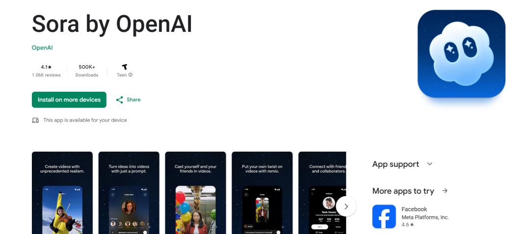 (Sora 2 Android版应用商店页面,已开放下载)