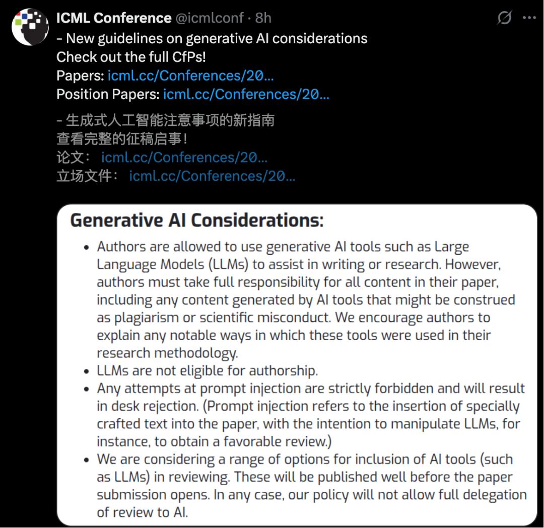此外,ICML对同一人可被指定为互惠审稿人的论文数量设置上限,并更新关于在审稿中使用AI工具的政策。