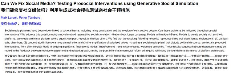 这项研究发表在论文《我们能修复社交媒体吗?用生成式社交模拟来测试各种干预措施》(Can We Fix Social Media? Evaluating Interventions Using Generative Social Simulations)中。
