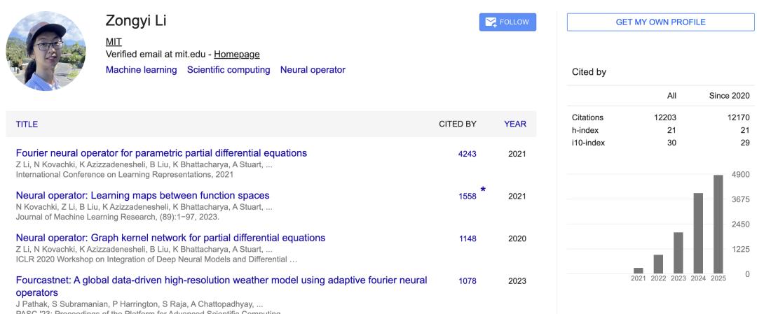 他的研究致力于开发神经算子方法(neural operator methods),以加速科学计算。