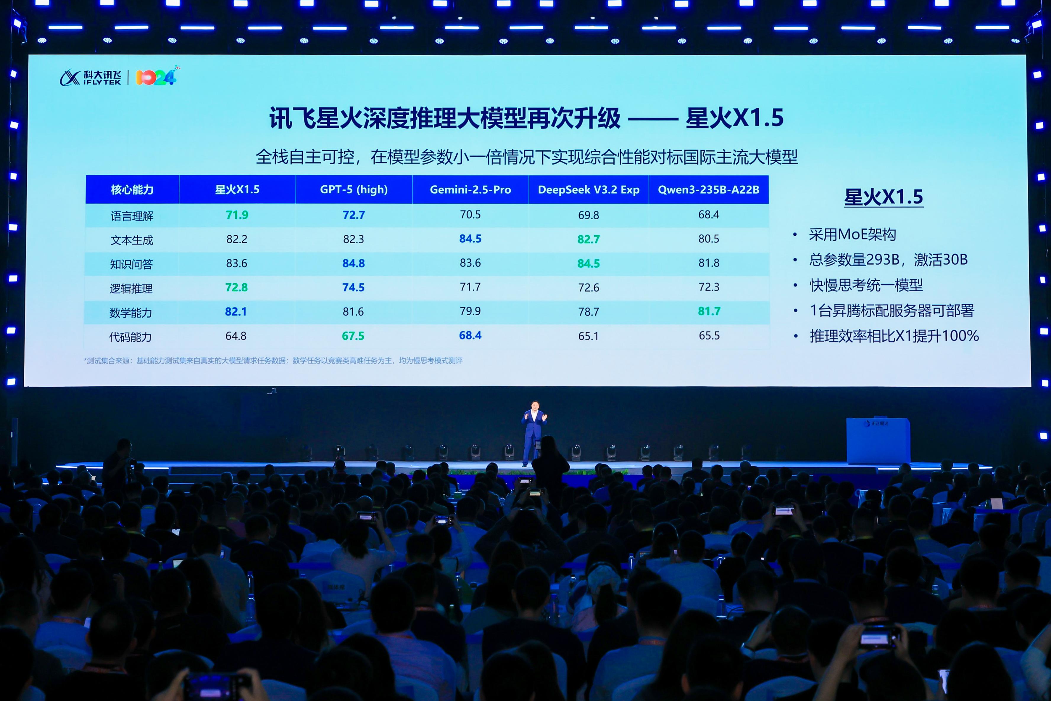 11月6日,在第八届世界声博会暨2025科大讯飞全球1024开发者节上,科大讯飞发布星火大模型X1.5,采用MoE架构,总参数量293B、激活30B,推理效率相比星火X1提升100%。在语言理解、文本生成、知识问答、逻辑推理、数学能力、代码能力等六大核心能力全面对标国际主流,其中数学能力持续保持国际领先。其多语言能力覆盖超过130个语种,整体性能达到GPT-5的95%以上,其中拉美、东盟等14个重点语言效果领先。