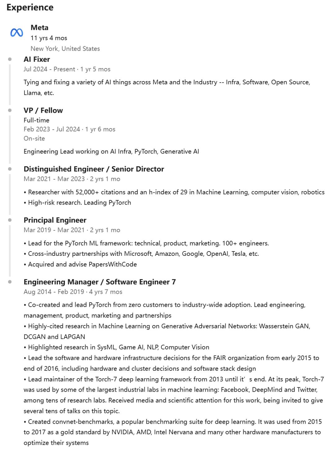 可以看到,从2014年入职后,Soumith在Meta就像升级打怪一样,不断晋级到VP级别。