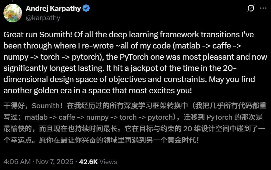 Karpathy称,自己经历过那么多ML框架的折腾,每次都得几乎重写所有代码,但从Torch转向PyTorch至今,是体验最愉快、最久的。
