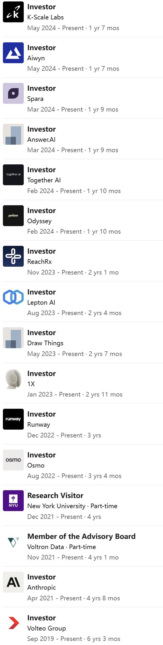 在投资领域,Soumith的投资大多在个人的社交圈内——主要是当朋友们创业时,除此之外很少投资。投资过的公司包括Runway、1X、Osmo、Anthropic、Together.ai、Lepton等。