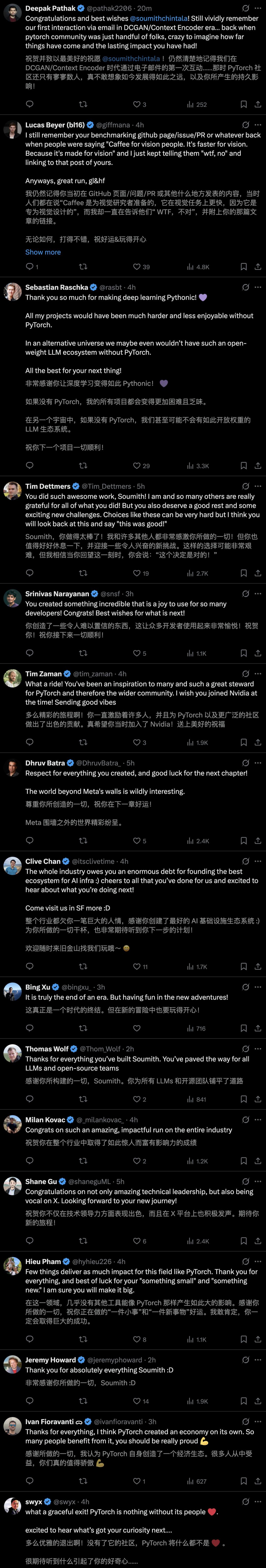 一时间,来自学界,以及OpenAI、特斯拉、英伟达、Hugging Face等大厂和初创的AI大牛们,纷纷向Soumith送上告别与祝福。