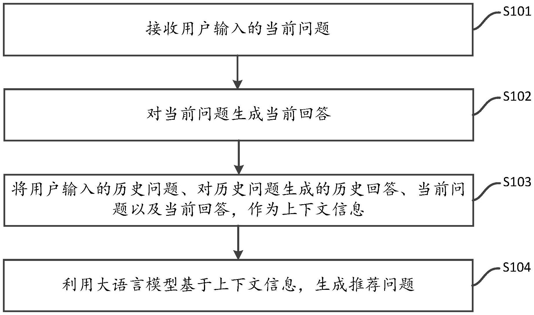 本公开提供了一种基于大模型的推荐问题生成方法、装置、电子设备及介质,涉及人工智能技术领域,尤其涉及自然语言处理、大语言模型、智能客服技术领域。具体实现方案为:接收用户输入的当前问题,并对当前问题生成当前回答。之后将用户输入的历史问题、对历史问题生成的历史回答、当前问题以及当前回答,作为上下文信息。再利用大语言模型基于上下文信息,生成推荐问题。实现了增强推荐问题的多样性。