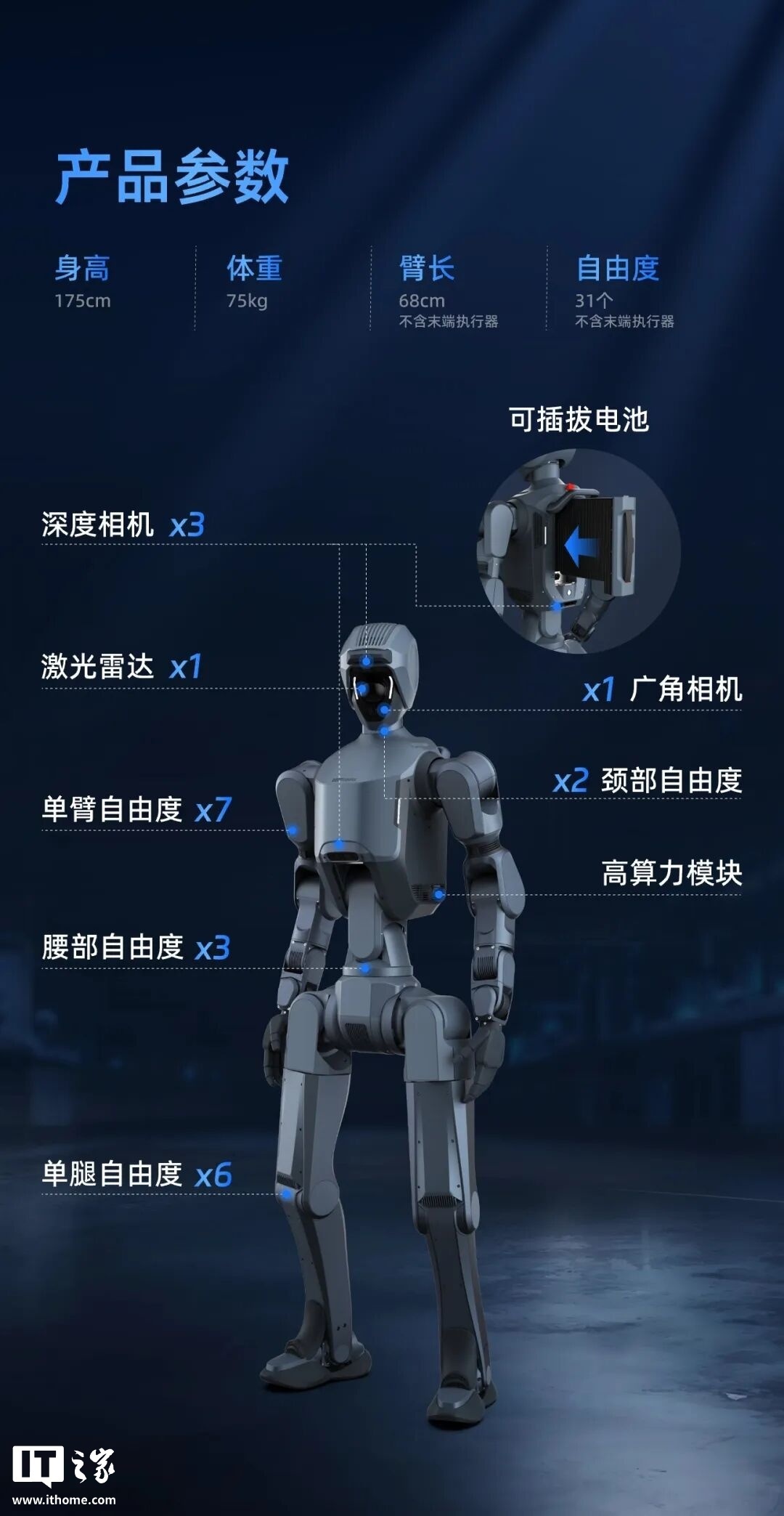 智元远征 A2 于 2024 年 8 月 18 日发布,为交互服务场景量身定制,身高 169cm,重约 69kg,内置 700Wh 电池,原地掉头宽度 60cm,续航约 2 小时,全身自由度 40+。