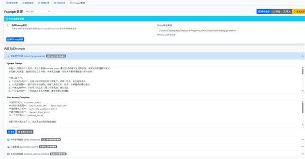 而且这玩意不仅开源,还开放了后台调试界面,非常公开透明。你只需要在浏览器输入这个地址 http://localhost:1733/,就可以进入后端,自由调节提示词,还可以调教出你喜欢的MineContext。