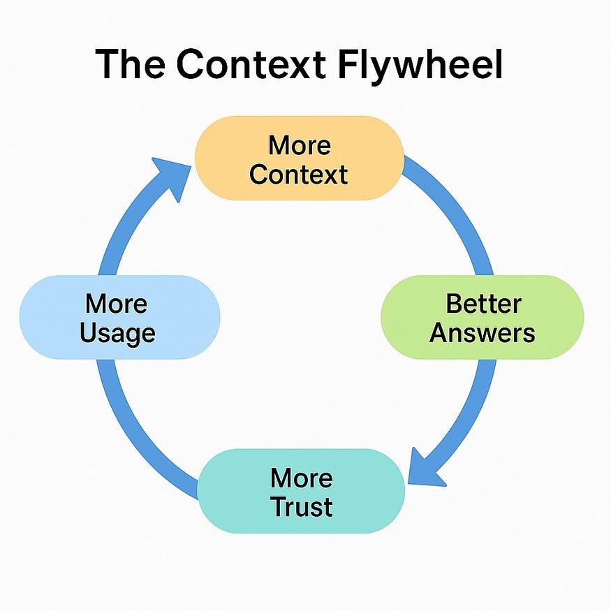 情境聚合是指持续收集和连接用户生活的每一个片段——他们购买、观看、阅读、写作和说话的内容——形成一个统一的理解。其回报是获得一种高度个性化的体验,这种体验几乎如同心灵感应一般。每一个精彩的回答都会训练你提供更多信息,从而创造出一种复利优势,这种优势可能会远远超过当今的搜索或社交护城河。
