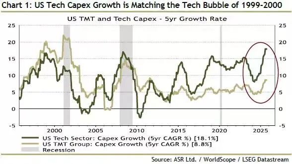 第一张显示当前美国科技行业资本支出(Capex)的增长水平,已与1999年至2000年互联网泡沫时期的水平相当。