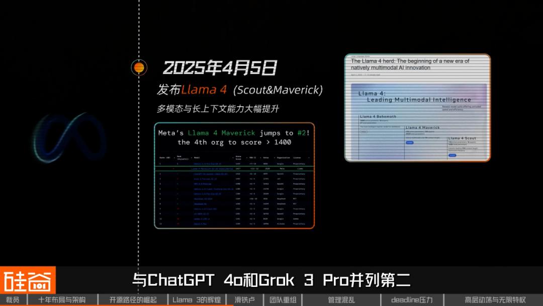 但大家看看这个时间线,是不是还是觉得很割裂,在Llama 3和Llama 4的这一年中,发生了什么?怎么Llama 4一下子就不行了?这是不是也太快了。