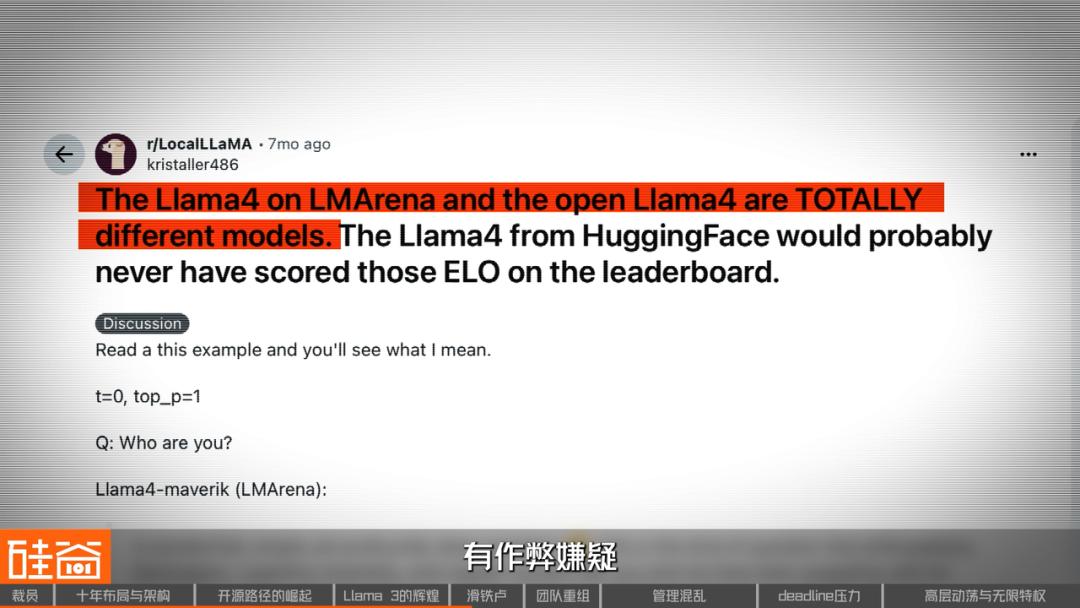 然而很快,开发者社区的反馈并不正面,认为Llama 4的效果不及预期。市面上开始有流言质疑Meta在LMArena上冲到第二名的版本有作弊嫌疑,怀疑Llama 4给LMArena排名的是经过了优化的变体,而这个变体经过了对话强化的训练,存在误导LMArena、导致过拟合的现象。