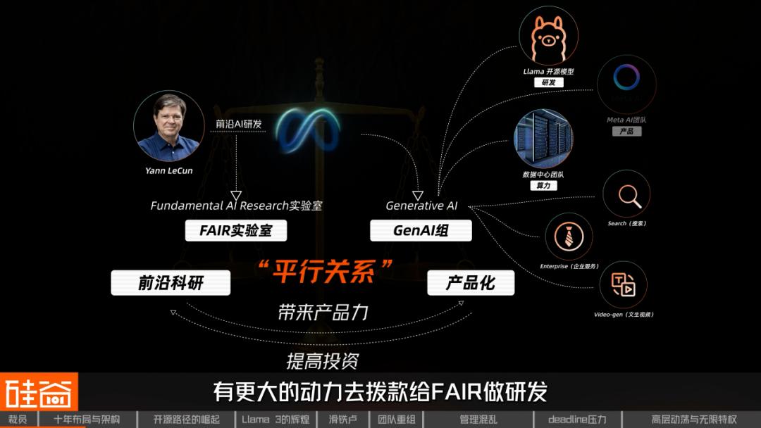 GenAI和FAIR是平行关系,这像是一个天平,一边是前沿科研,一边是产品化。理想情况下,前沿研究能带来更好的产品力,而产品赚钱了能让管理层有更大的动力拨款给FAIR去做研发。