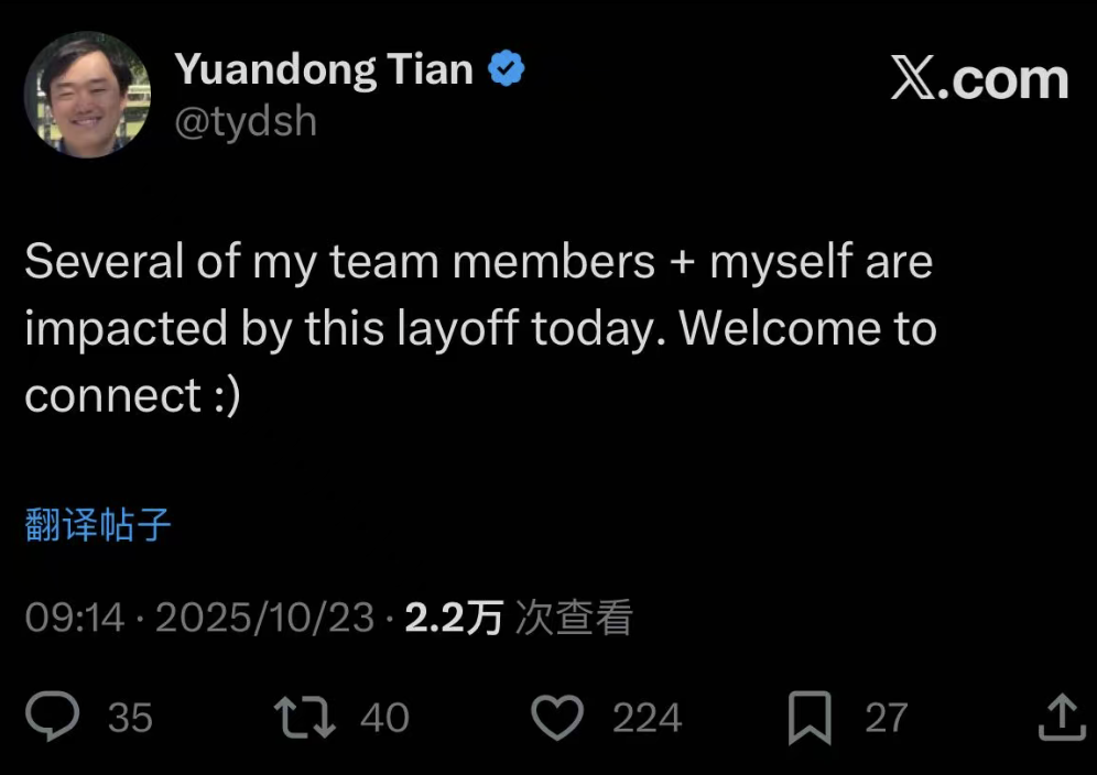 就在上个月,在亚历山大王的主导之下,FAIR的科学家总监田渊栋连同他的团队被突然裁撤。