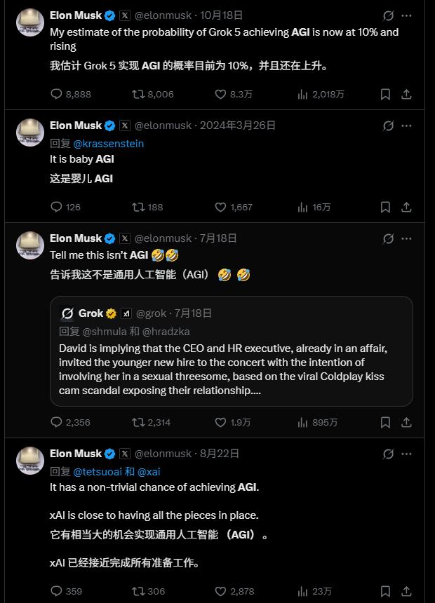 咱去马斯克的社交平台上逛一圈,会发现他三句不离AGI。。