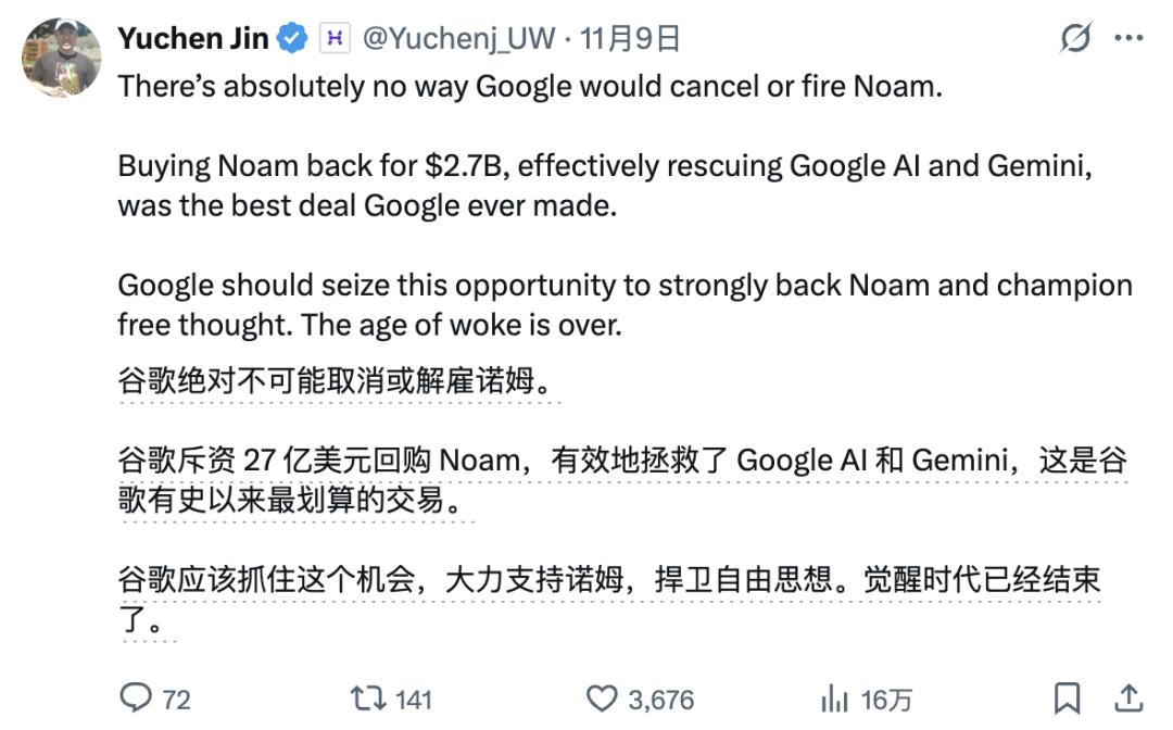 Hyperbolic Labs的联创兼CTOYuchen Jin也认为,把Noam挖回来是谷歌有史以来最划算的一笔交易,绝不可能因为这件事将他解雇,并且应该抓住这个机会大力支持Noam。