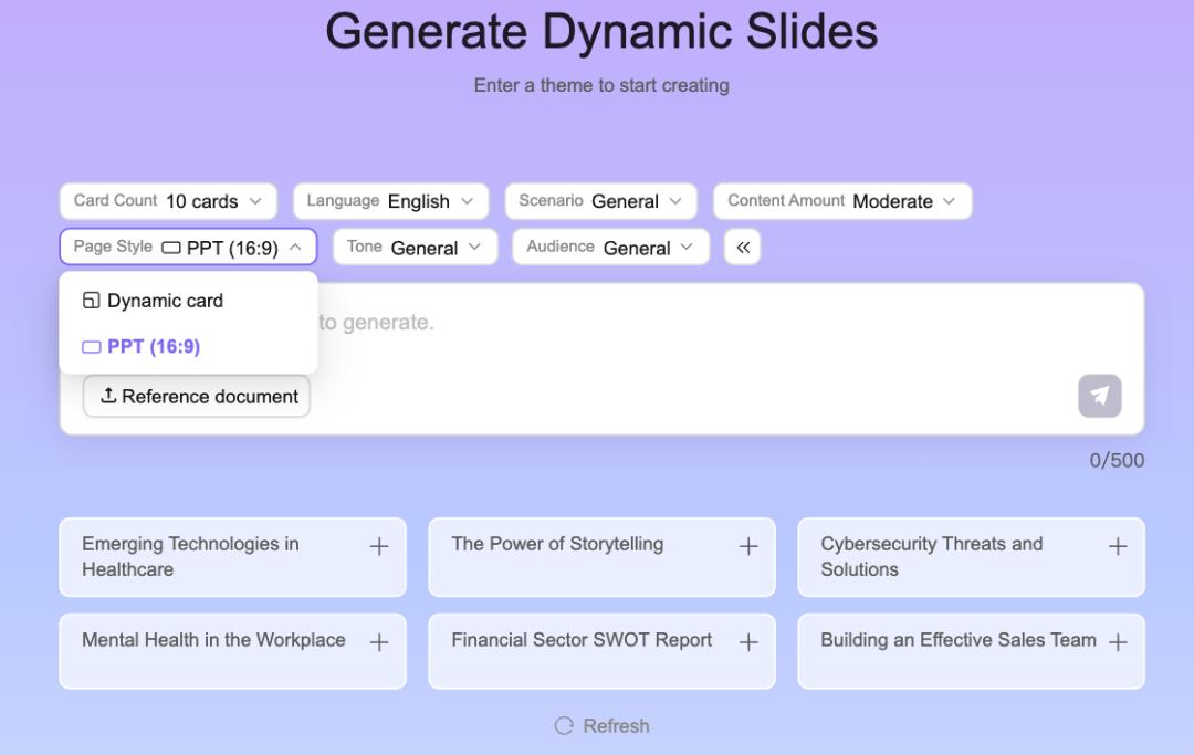 去年 9 月测试 Gamma 的时候,其最大的差异点就是“无限画幅”和“卡片式编辑”,而现在,在生成内容之前,用户可以从演示文稿、网页、文档、社媒等四种内容形式当中选择(这个选择主要影响信息密度、图文的比例),如果用户选择了演示文稿,则可以选择动态调整画幅(对应无限画幅)或固定画幅比例为 16:9 或 4:3。而根据笔者的测试,如果用户选择默认,生成出来的内容绝大多数情况也会趋近于 16:9 的传统 PPT 画幅比例,只不过在编辑时不会限制画幅。