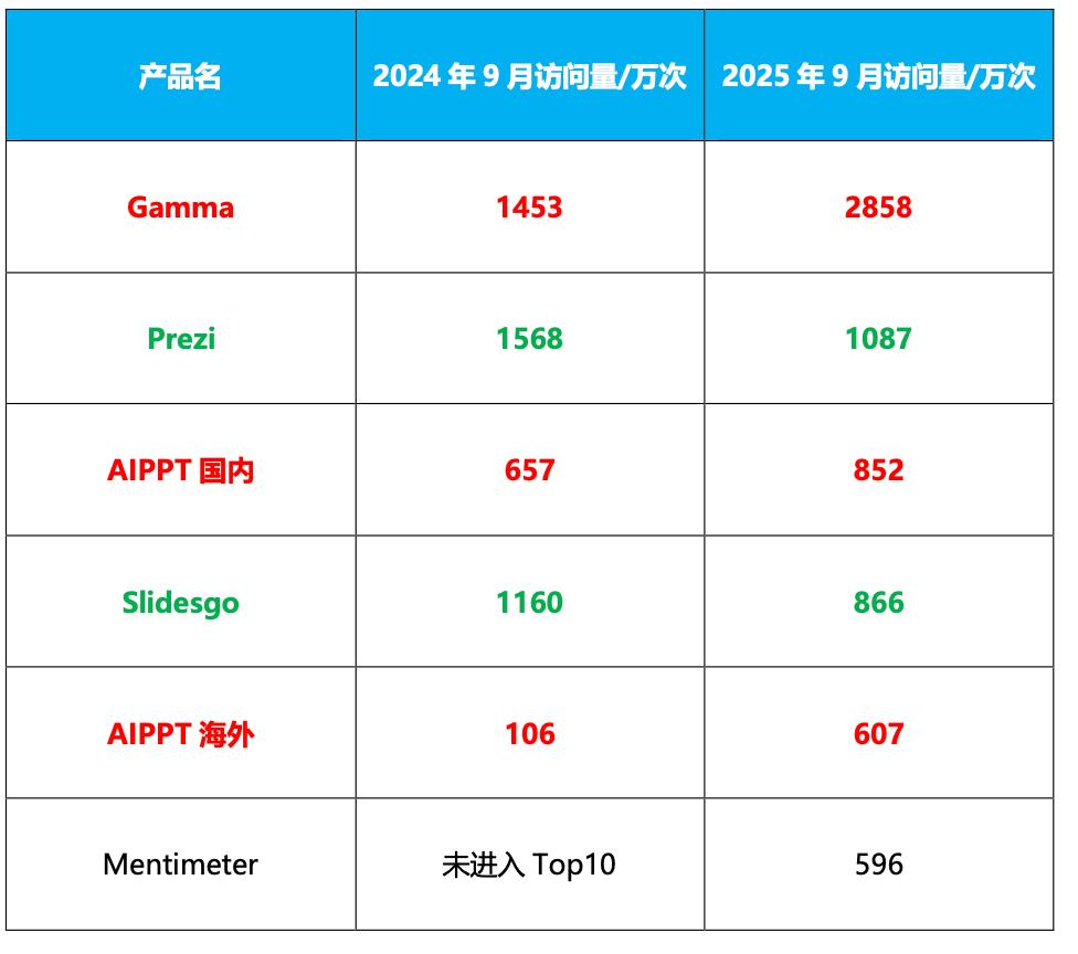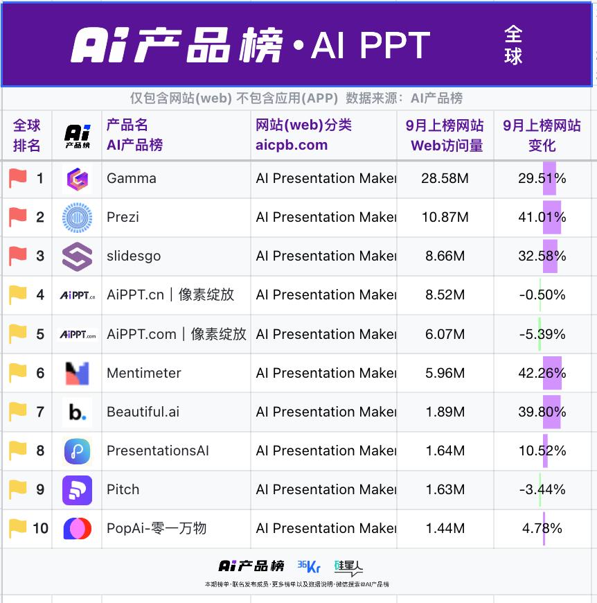 数据来源:AI产品榜、参考Similarweb进行了修正,按2025年9月流量排序,注:Similarweb显示AIPPT国内、海外的流量数据分别为27万、77万,显著低于AI产品榜数据,但是AIPPT官方在融资新闻中引用了AI产品榜数据,所以这里也选用AI产品榜数据。