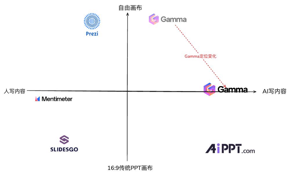 但从表格也能看出来,AI PPT 赛道并不是普涨,而是两升两降,Gamma、 AIPPT 上升,而突出模板和效果、走“老产品+AI”模式的 Slidesgo 和 Prezi 下降。从定位上看,AI+PPT 赛道可以以“人写内容-AI 写内容”“自由画布-传统 16:9 画布”的象限来进行定位,而从产品的演进看“16:9 传统画布”与“AI 写内容”结合的流量表现会更好。