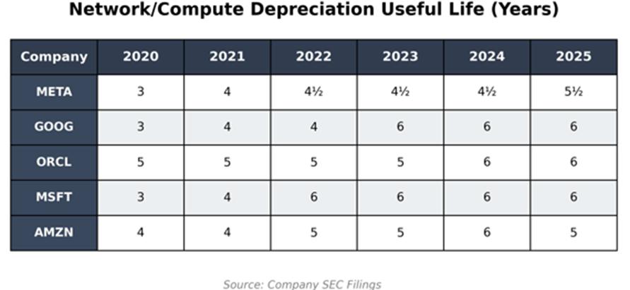 然而,包括Meta、Alphabet、微软、甲骨文和亚马逊在内的“超大规模”玩家们却正是这么做的,一些公司甚至将折旧周期延长至6年。