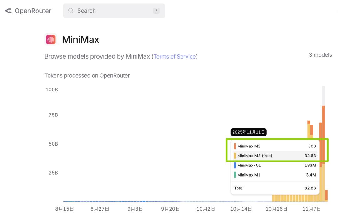 10月底发布的M2,在OpenRouter这个全球最大的模型聚合平台上的成绩,则证明了其在文本模态上的实力。