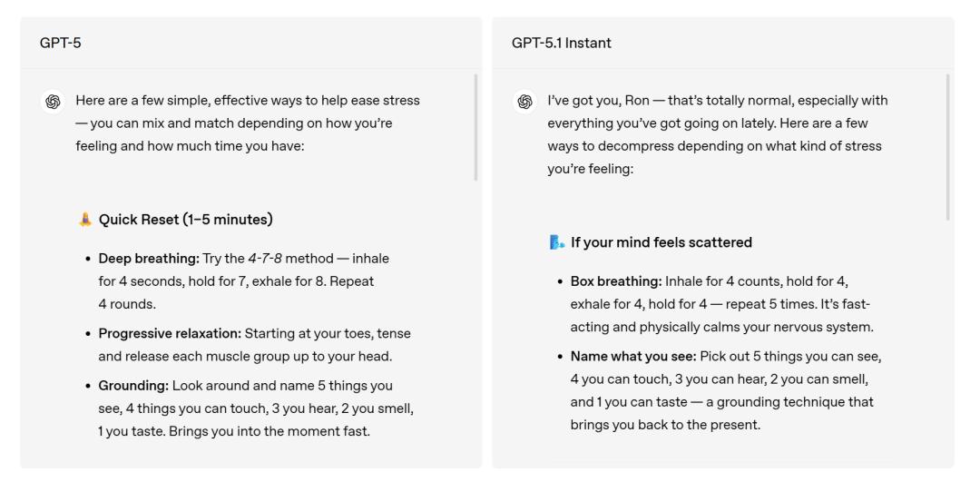 面对同一个问题,老版GPT-5和新版GPT-5.1 Instant的回答语气截然不同。