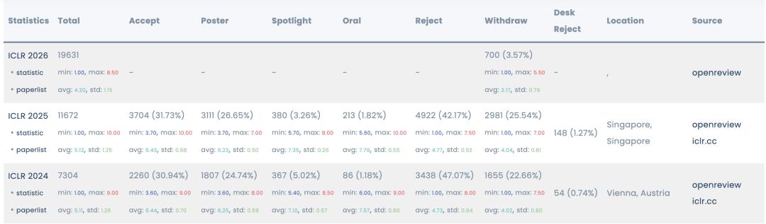 链接:https://papercopilot.com/statistics/iclr-statistics/iclr-2026-statistics/