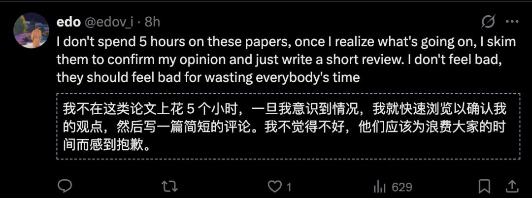 不过,他之后另发推文表示,某些论文和评审的质量之低,让人沮丧。