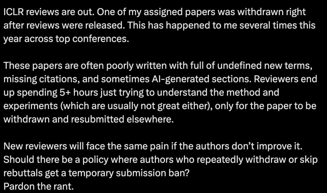 他提议:「是否该设立某种机制,对那些频繁撤稿或无故跳过rebuttal阶段的作者,给予临时投稿禁令?」