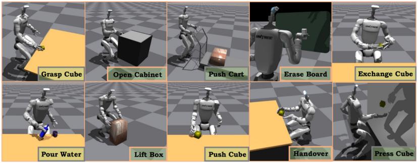 团队在仿真环境(IsaacGym)与真实Unitree G1机器人上,针对10项移动操作任务(如搬箱子、开门、倒水、递物等)开展全面验证,核心结果如下: