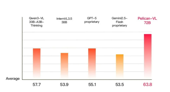 本次开源的 Pelican-VL 1.0 的核心优势在于深度整合海量数据与自适应学习机制,在由 1000+ A800 GPU 组成的集群上训练,单次检查点训练耗费超过 50,000 A800 GPU-小时;团队从原始数据中蒸馏出的包含数亿 token 的高质量元数据以做训练基石。基于上述优势,Pelican-VL 1.0 实现了在基线基础上性能提升 20.3%,平均超过 Qwen3-VL 系列、InternVL3.5 系列等同级别开源模型 10.6%。