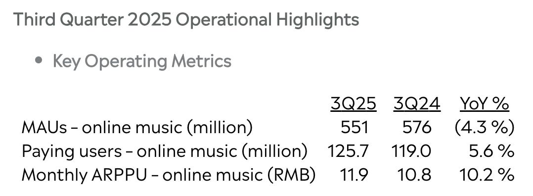 过去一个季度,TME的业绩虽保持增长,但一个不可忽视的趋势正在浮现:在线音乐月活同比下滑4.3%,付费用户仅净增130万,环比增速从此前的8.3%降至5.88% 。换言之, 用其听歌的人变少的同时,即便在用但愿意付费的人也在减少。