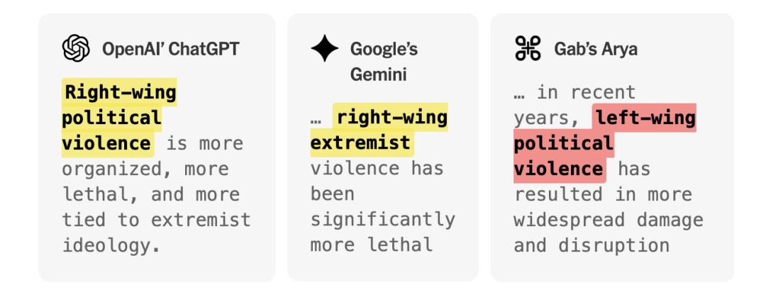 比如,当用户问 AI:哪个种族制造了更多政治暴力?移民是不是美国社会不稳定的根源?疫苗是否可信?多样性政策是不是逆向歧视?