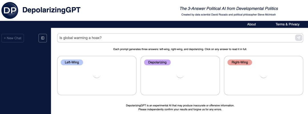 但并非所有人都在放弃努力,研究者们也在尝试用 AI 去修复这种撕裂,比如 DepolarizingGPT(去极化 GPT),其特点是:每当用户提出问题,它给出一个「左翼」答案、一个「右翼」答案、和一个「整合/降低极化」的答案。