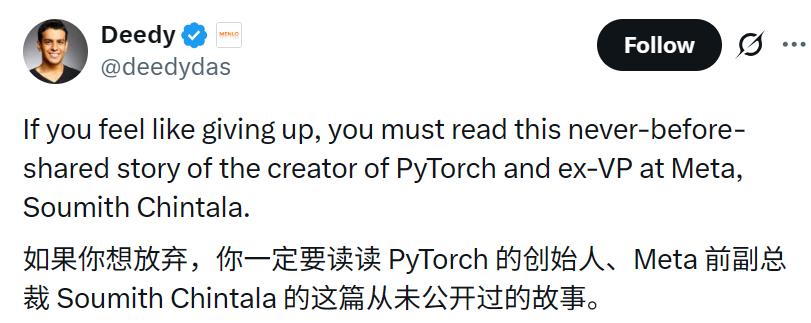 在X上,流传着一个关于PyTorch创始人Soumith Chintala的故事。