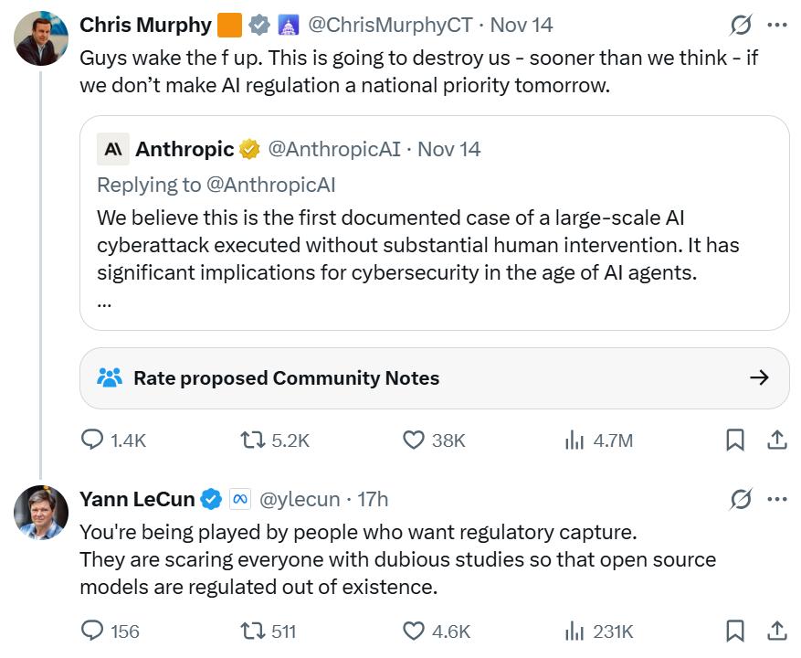 图灵奖获得者、Meta 首席科学家 Yann LeCun 在回复美国康涅狄格州参议员 Chris Murphy 表达担忧的帖子下表示,“你在被那些想通过监管来垄断行业的人戏耍。他们利用可疑的研究来恐吓所有人,从而让开源模型被监管到无法生存。”