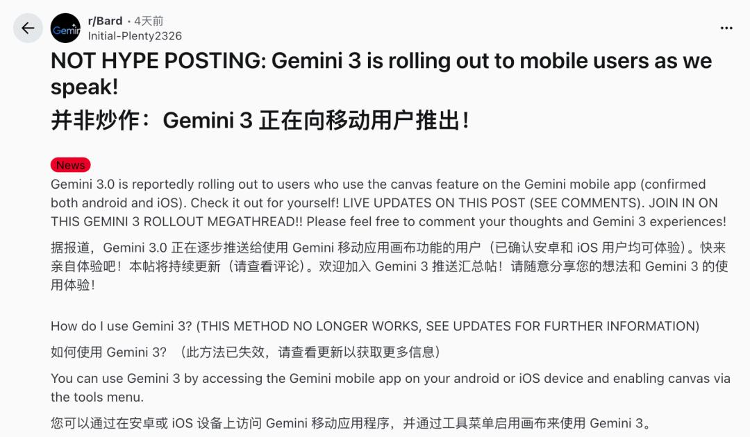 图片来源: https://www.reddit.com/r/Bard/comments/1ovvmjo/not_hype_posting_gemini_3_is_rolling_out_to/