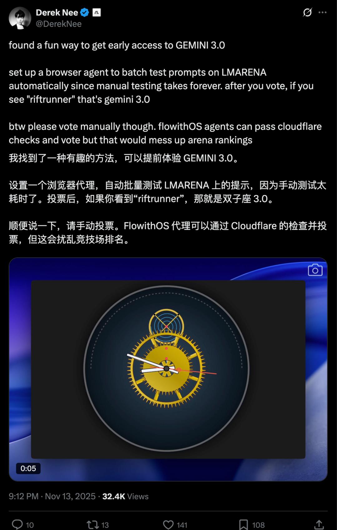 为了减少反复尝试的痛苦,Flowith 的创始人还发 X,分享了通过设置浏览器 Agent 来自动投票,更快找到 riftrunner 的方法。