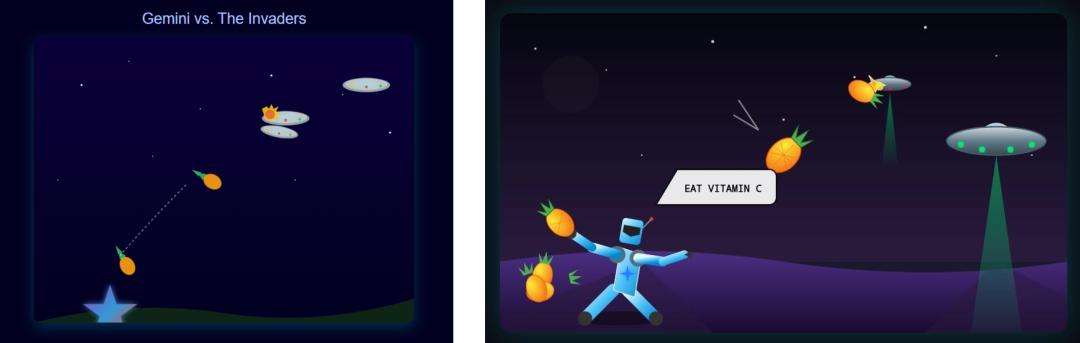 还有网友做的 Gemini 和外星人入侵的对抗的 SVG,网页版继续一如既往的简陋,而在手机上的 Canvas 明显元素更多,更丰富。