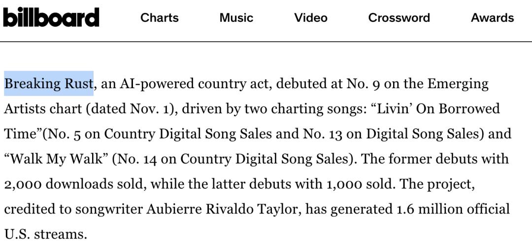 最近,公告牌乡村数字单曲销量榜(Billboard’s Country Digital Song Sale)冠军竟是一首由AI生成的乡村歌曲。