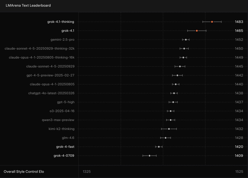 Grok 4.1在国际盲测平台LMSYS Arena上的表现出现了跃升式变化。在最新一轮评测中,Grok 4.1的Thinking模式(代号quasarflux)获得1483 Elo(Elo评分体系,用于衡量模型在盲测对战中的相对实力),位居所有公开模型之首;它的非推理模式也达到1465 Elo,位列第二。这一成绩本身就足够罕见——它在不使用思维链的情况下,表现依旧超过许多其他模型在启用完整推理配置时的水平。