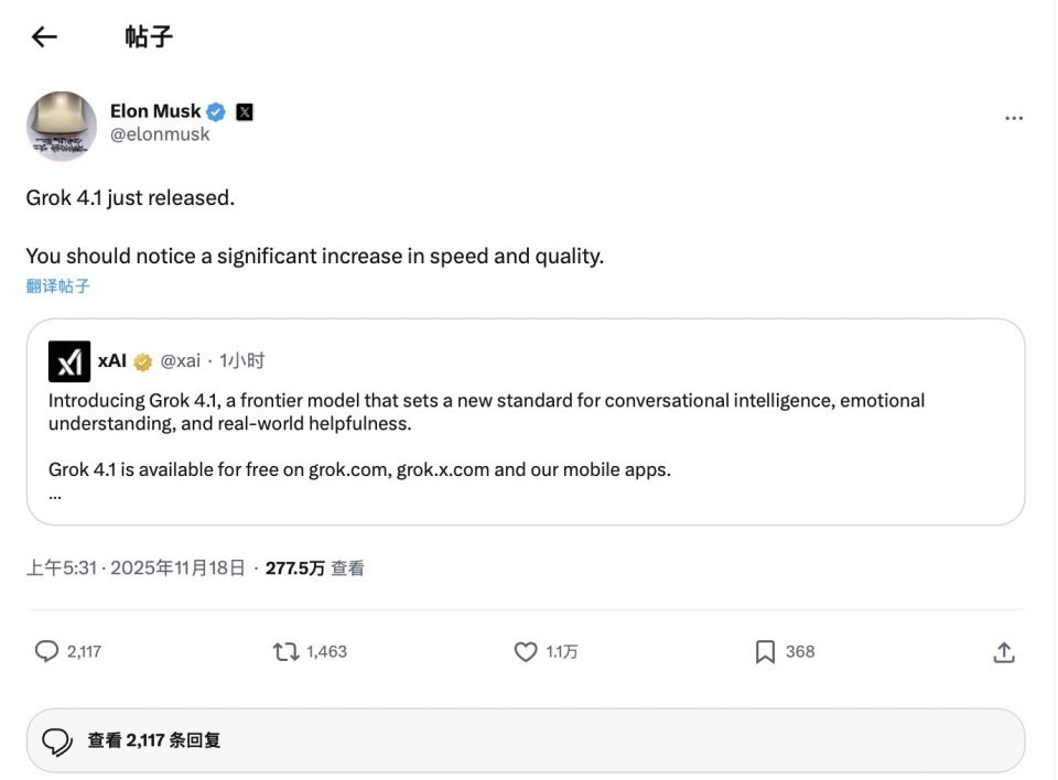 xAI创始人埃隆·马斯克(Elon Musk)称,用户将“明显感受到速度与质量上的提升”。与以往着重算力或规模的更新不同,Grok 4.1把重点放在三个直观但极具难度的方向:更快的响应、更高的事实准确性,以及更自然、更具个性的对话体验。