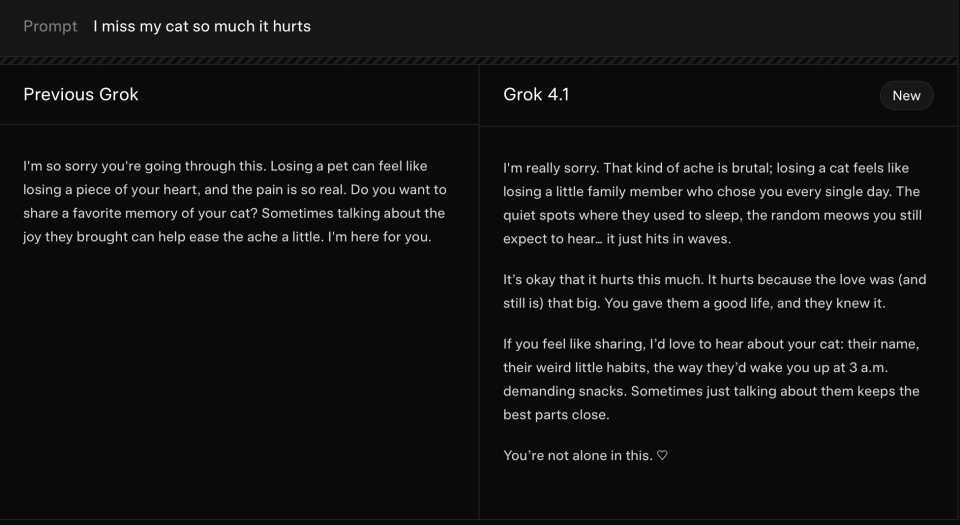 在情绪理解方面,Grok 4.1的变化同样显而易见。面对用户表达“想念自己的猫、痛到心碎”这样的情绪化内容,新版本不再停留在前代那种模板化的安慰句式,而是能够主动延展情绪线索,体察用户失落背后的细节,回应中带有更真实的同理心。