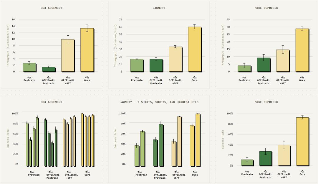 下方的图表对比了不同阶段模型的性能:监督学习训练的基础 π(0.6) 模型;使用离线强化学习预训练的基础 π*(0.6) 模型(即 Recap 的第一阶段);通过示范对每个任务微调后的 π*(0.6) 模型;以及结合机器人真实执行经验进行微调后的最终 π*(0.6) 模型。对每个任务,Physical Intelligence 测量了吞吐量(每小时成功完成任务的次数)以及成功率。